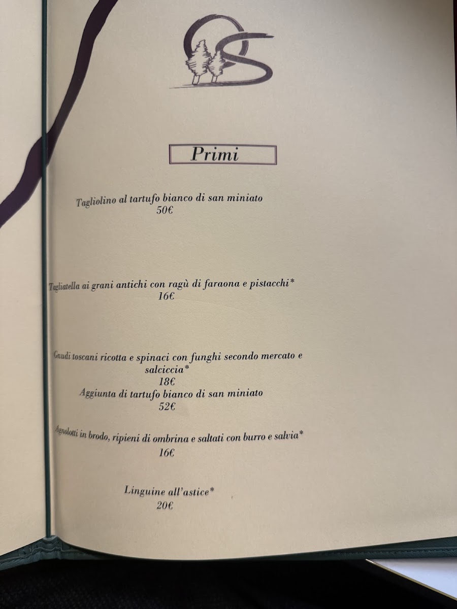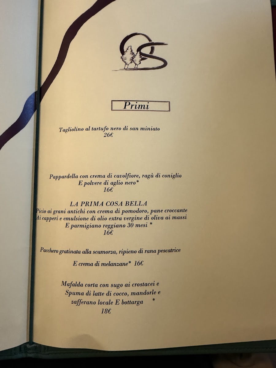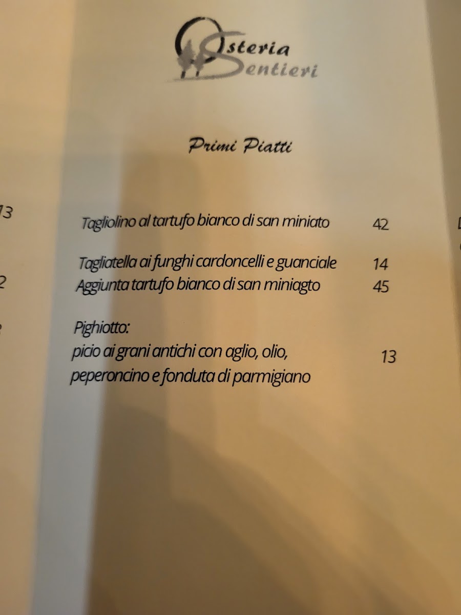 The menu at Osteria Sentieri reflects a thoughtful balance between rustic Tuscan tradition and refined culinary execution, leaving a lasting impression that lingers well beyond the final bite. Each dish feels carefully curated, with an emphasis on high-quality, locally sourced ingredients that speak to the region’s rich gastronomic heritage. Among the highlights, the Truffle Pasta stands out as a true centerpiece-rich, aromatic, and indulgently layered, it captures the essence of San Miniato’s famed truffle culture with elegance and restraint. The overall selection, though not overly extensive, demonstrates a clear confidence in craftsmanship, allowing each offering to shine without unnecessary complexity. From starters to mains, the menu maintains a consistent level of depth and authenticity, making it clear that the kitchen prioritizes flavor integrity over showmanship. In conclusion, Osteria Sentieri delivers a menu that feels both comforting and sophisticated, making it a memorable destination for those seeking a genuine yet elevated Tuscan dining experience.
