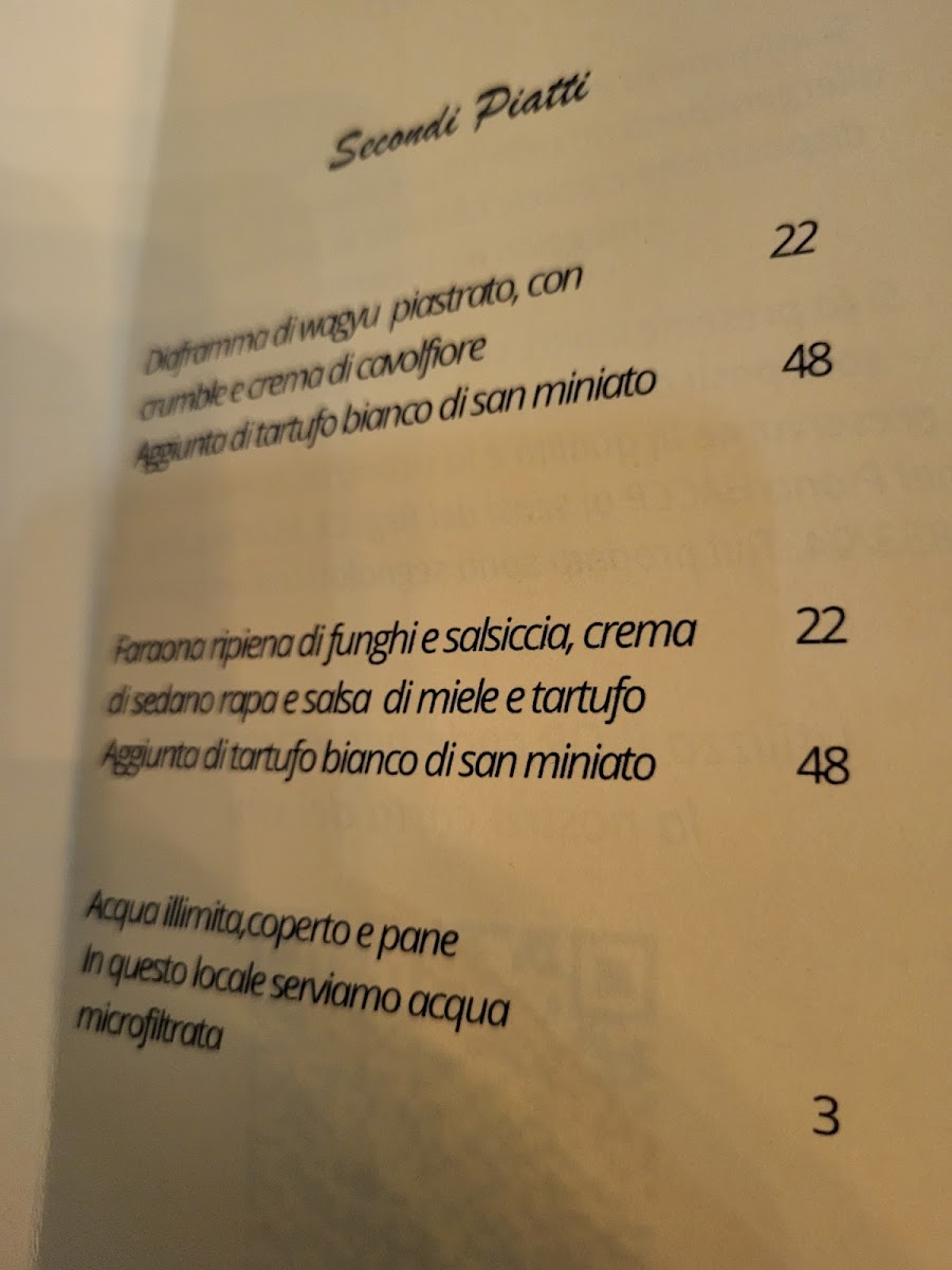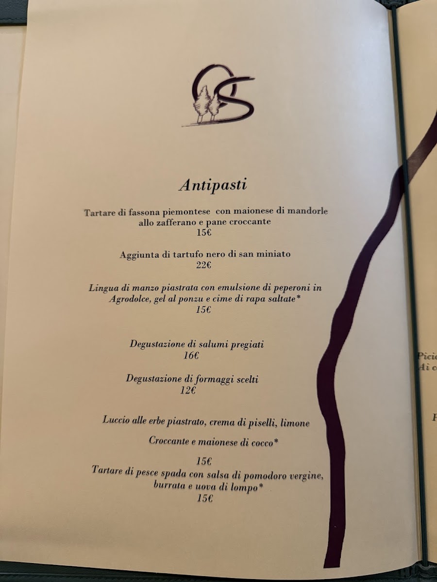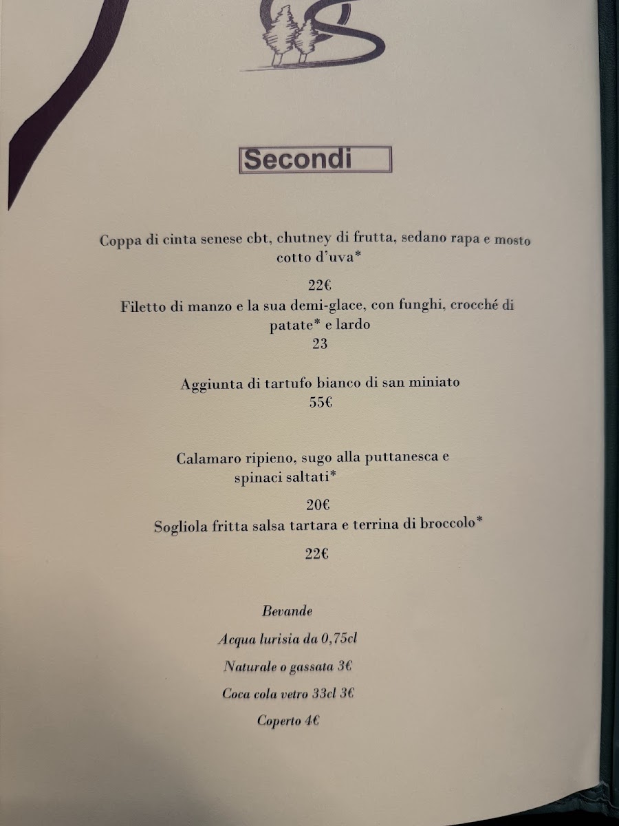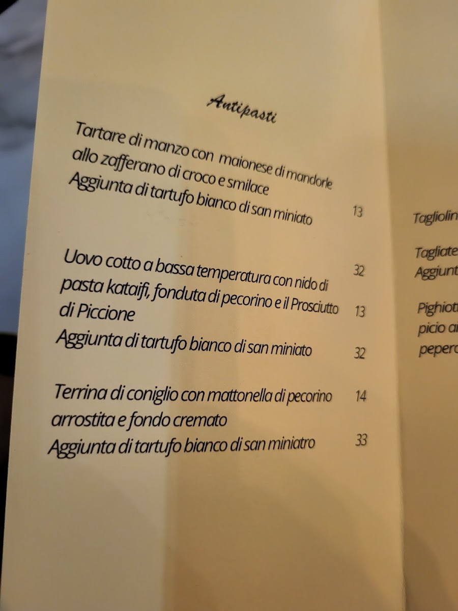 The menu at Osteria Sentieri reflects a thoughtful balance between rustic Tuscan tradition and refined culinary execution, leaving a lasting impression that lingers well beyond the final bite. Each dish feels carefully curated, with an emphasis on high-quality, locally sourced ingredients that speak to the region’s rich gastronomic heritage. Among the highlights, the Truffle Pasta stands out as a true centerpiece-rich, aromatic, and indulgently layered, it captures the essence of San Miniato’s famed truffle culture with elegance and restraint. The overall selection, though not overly extensive, demonstrates a clear confidence in craftsmanship, allowing each offering to shine without unnecessary complexity. From starters to mains, the menu maintains a consistent level of depth and authenticity, making it clear that the kitchen prioritizes flavor integrity over showmanship. In conclusion, Osteria Sentieri delivers a menu that feels both comforting and sophisticated, making it a memorable destination for those seeking a genuine yet elevated Tuscan dining experience.